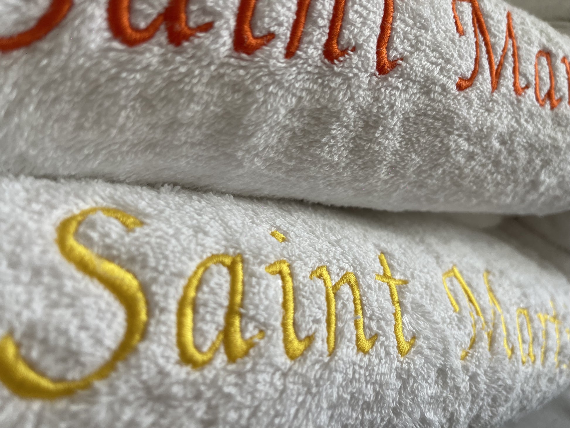 Leur design épuré et élégant, avec une broderie délicate de couleur sur un fond blanc immaculé, incarne la sophistication et s'intègre harmonieusement à tout type de salle de bain. Chaque détail a été pensé pour offrir une expérience luxueuse, au-delà du simple usage quotidien.