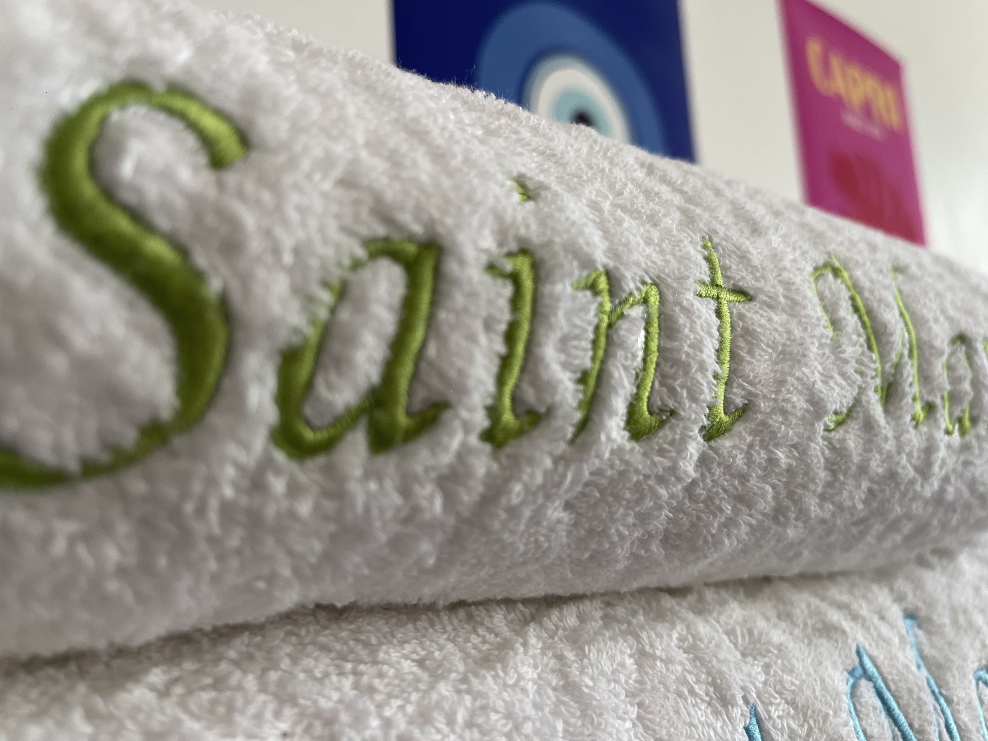 Leur design épuré et élégant, avec une broderie délicate de couleur sur un fond blanc immaculé, incarne la sophistication et s'intègre harmonieusement à tout type de salle de bain. Chaque détail a été pensé pour offrir une expérience luxueuse, au-delà du simple usage quotidien.